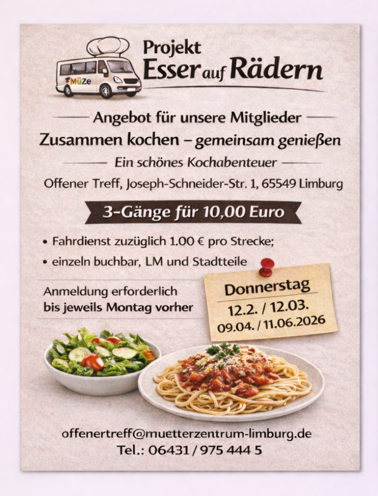 Wir bieten in 2026 wieder das Angebot Gemeinsam kochen – gemeinsam genießen – ergänzt um die ESSER auf Rädern. Zu unserem Mittagstisch für Mitglieder haben wir einen besonderen Service für alle, die nicht mehr so mobil sind und für die die Nutzung von öffentlichen Verkehrsmitteln sehr schweirig ist. Wir bieten euch einen Fahrservice zu unserem